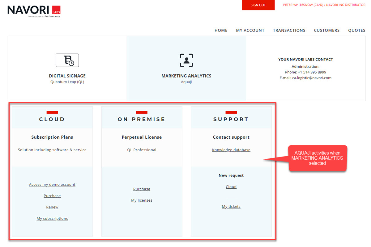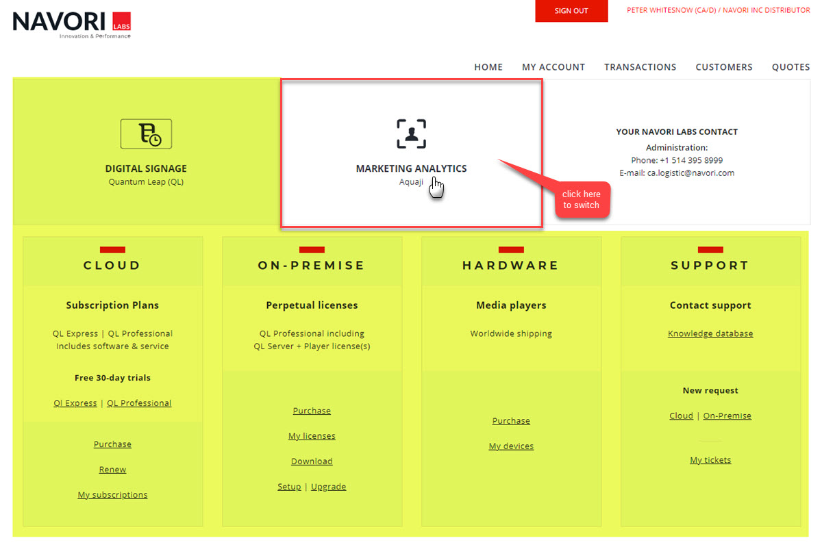 Navori Extranet Manual for DistributorsIntroductionYour home page Aquaji Software [MARKETING ANALYSIS] section All the options within the area highlighted in yellow relate to DIGITAL SIGNAGE. You must click MARKETING ANALYTICS to switch views. This is the default view when you login. AQUAJI view...
