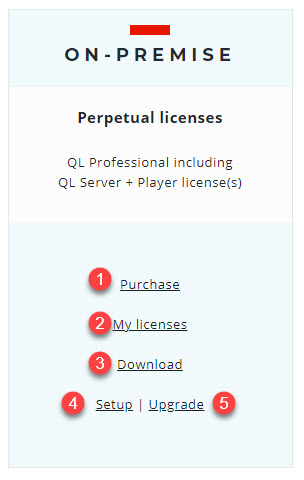 QL On-Premise licenses are perpetual with an annual support contract. Customers must purchase separate QL Server and QL Player licenses.