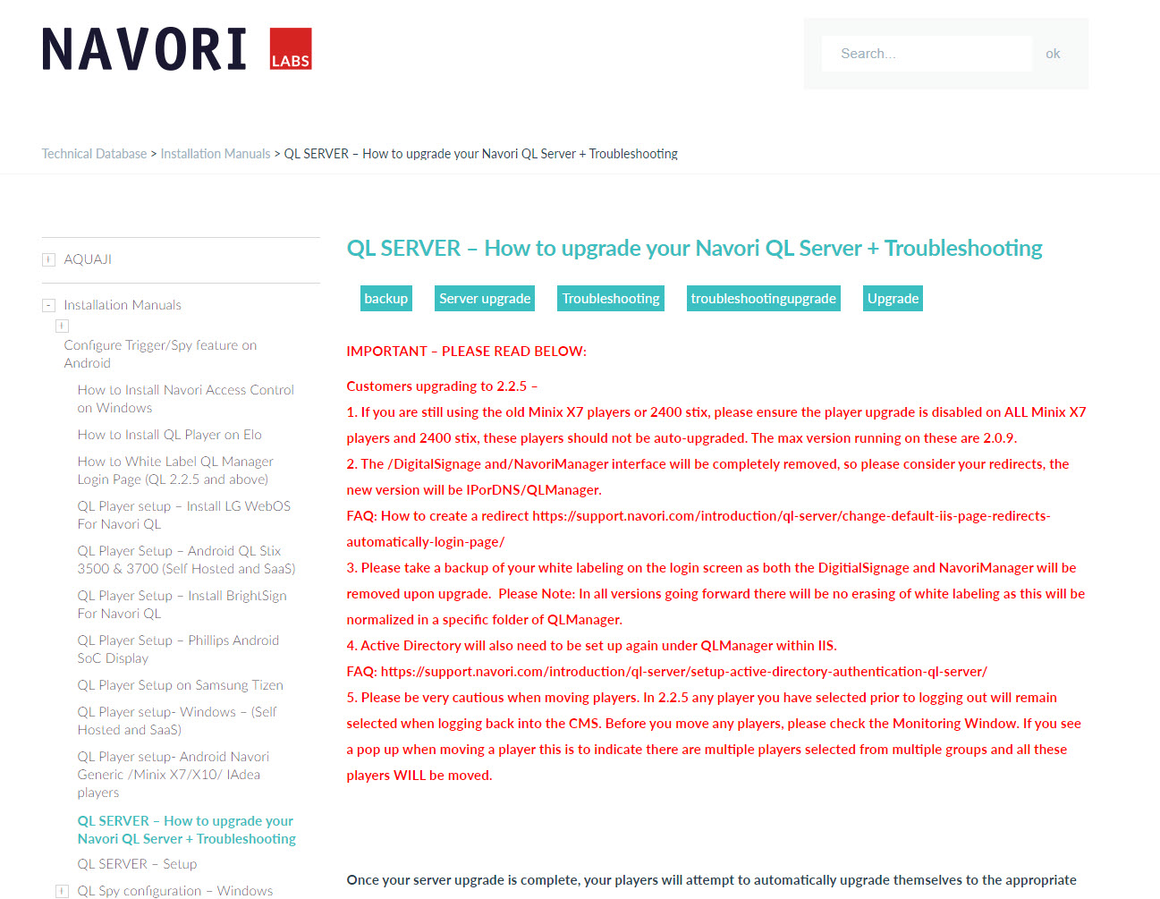 The Navori Support website will open and you will be redirected to the QL Server Upgrade and Troubleshooting instructions.