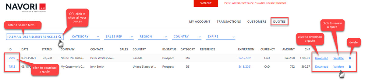 - Click the quote's ID number to download a copy of your quote. NOTE: you can also click the Download link in the right column.