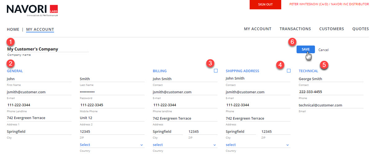 - When you are done, click SAVE. Your customer’s information will be recorded in the extranet’s database and the customer will be assigned to your account.